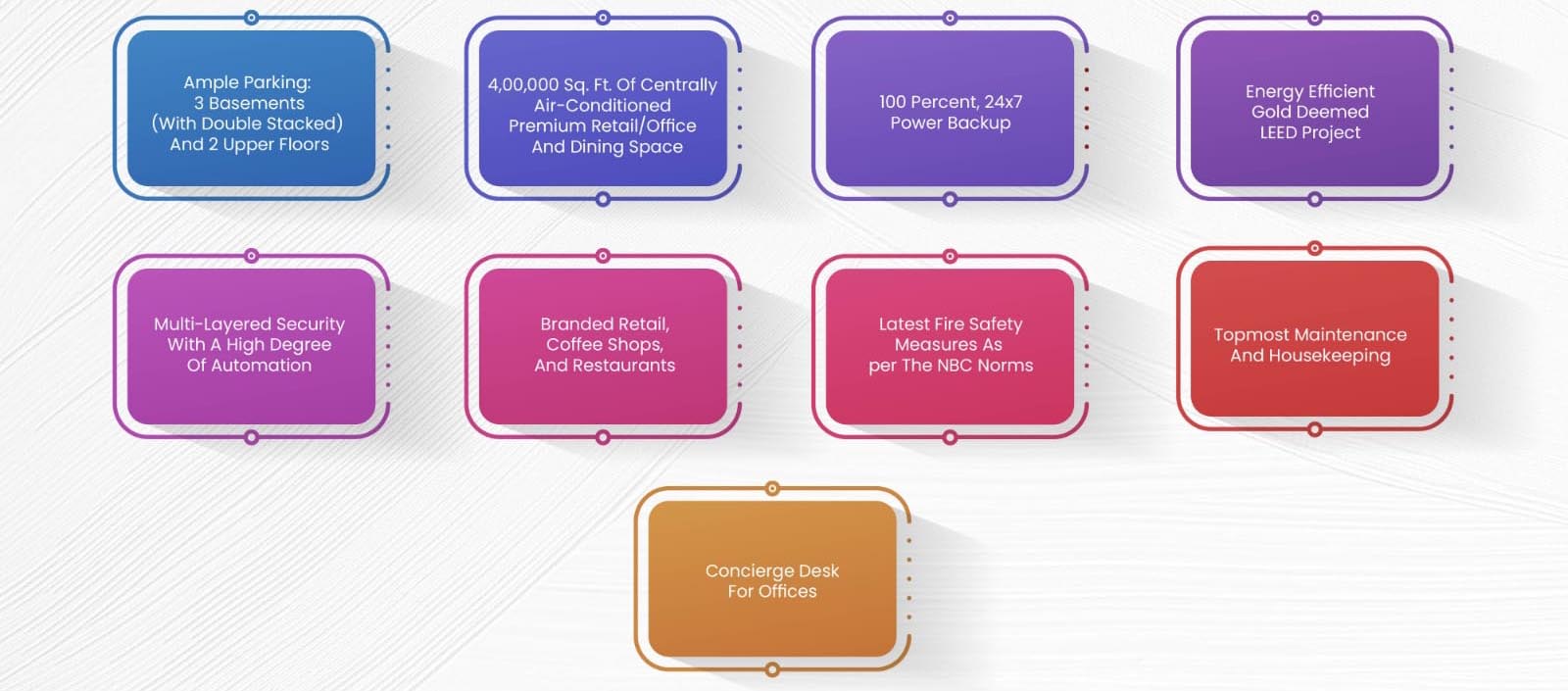 It has the capacity to cater to 300 Offices and retail shops, with offices starting from 700 sq. ft. and the latter starting from 300 sq. ft. Its fully-furnished conference and board rooms, aided with the most advanced technologies are no less than a star-studded affair.